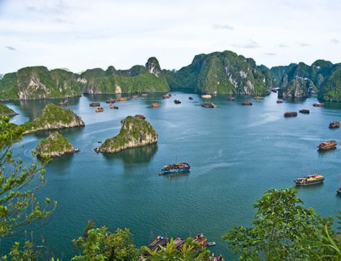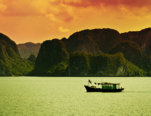 Travel to Halong Bay and board a luxury cruise. Visit Luon Cave, Titop Island, and enjoy sunset with dinner onboard. Overnight on the cruise.